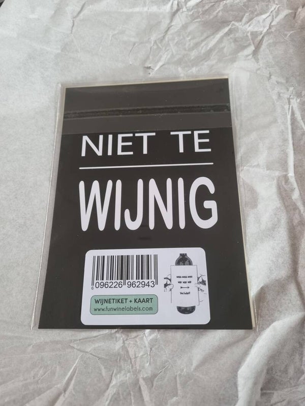 Daarnaast zit er een zwarte ansichtkaart bij met de tekst “Niet te wijnig”, verpakt in een hersluitbaar zakje. Zo wordt elke fles meteen een feestelijk cadeau—gereed om te geven, zonder gedoe.