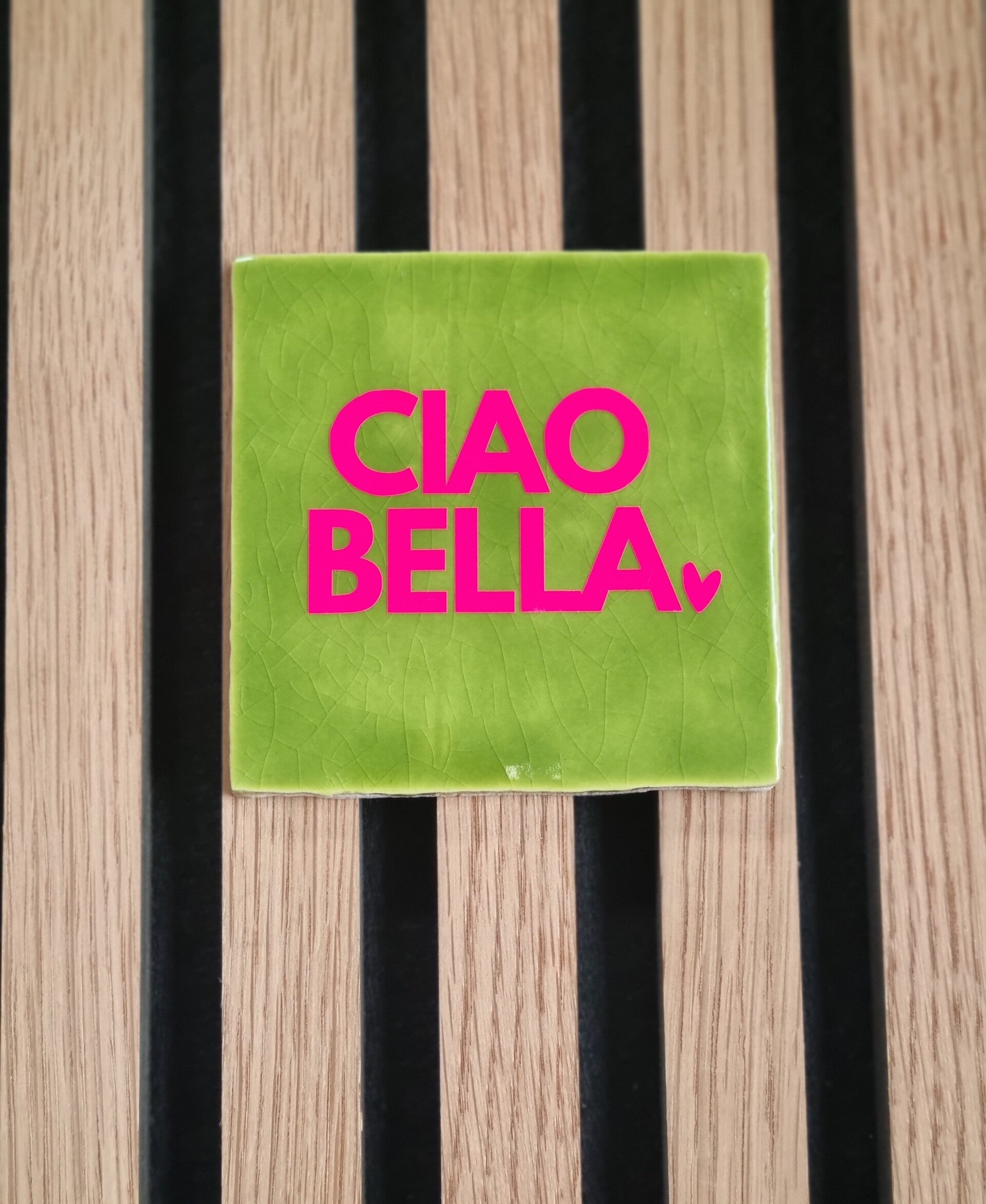 Dit tegeltje is bewerkt met een vinyl applicatie. De tegeltjes uit deze serie zijn niet hitte, water en weersbestendig en kunnen het beste worden afgenomen met een droge stofdoek!
