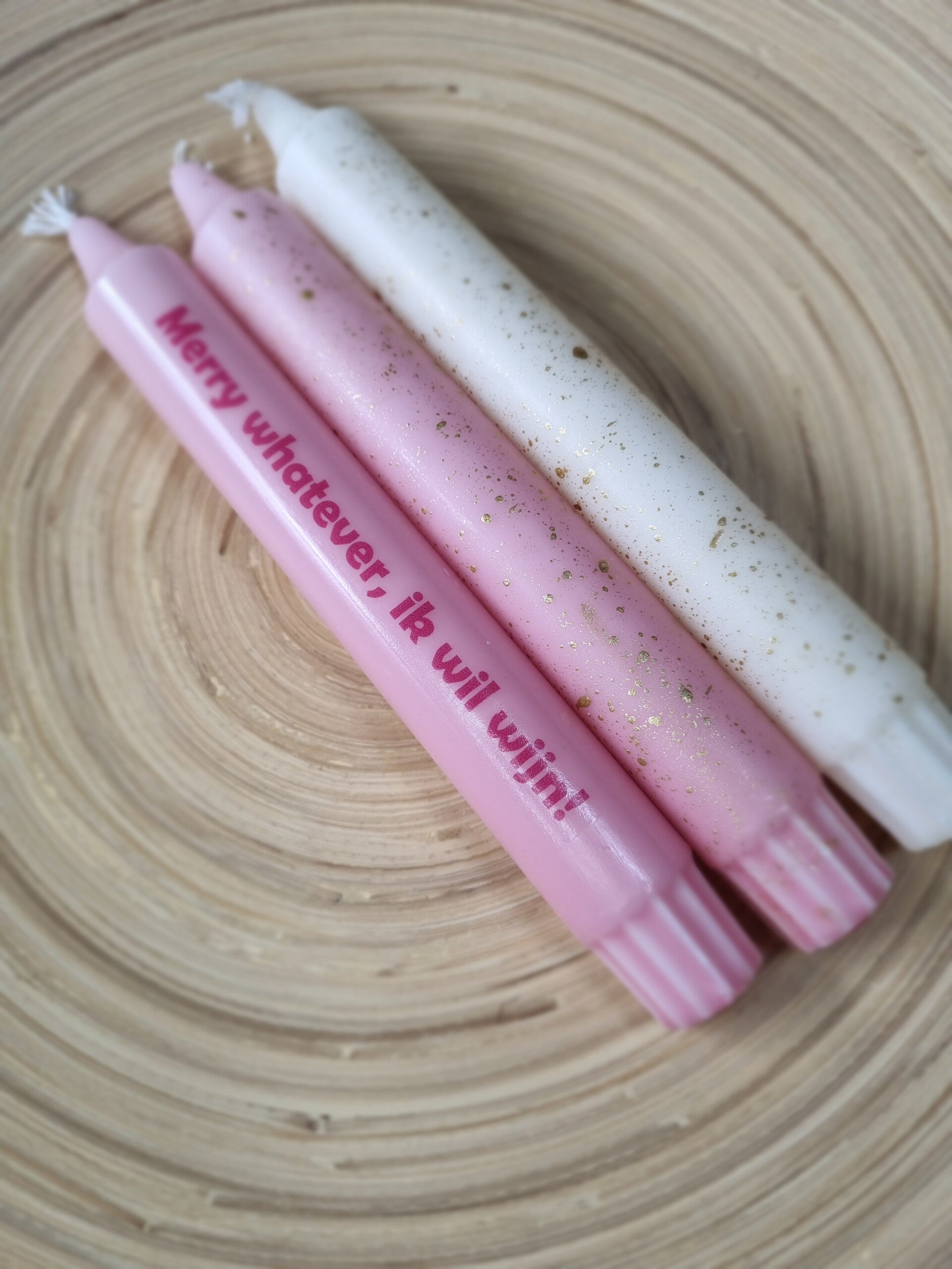 Breng een vleugje humor en stijl in huis met deze handgedipte roze kaars. De rode tekst “Merry whatever, ik wil wijn” maakt hem niet alleen feestelijk, maar ook heerlijk eigenwijs. Perfect voor wie de feestdagen graag met een knipoog én een goed glas wijn viert.