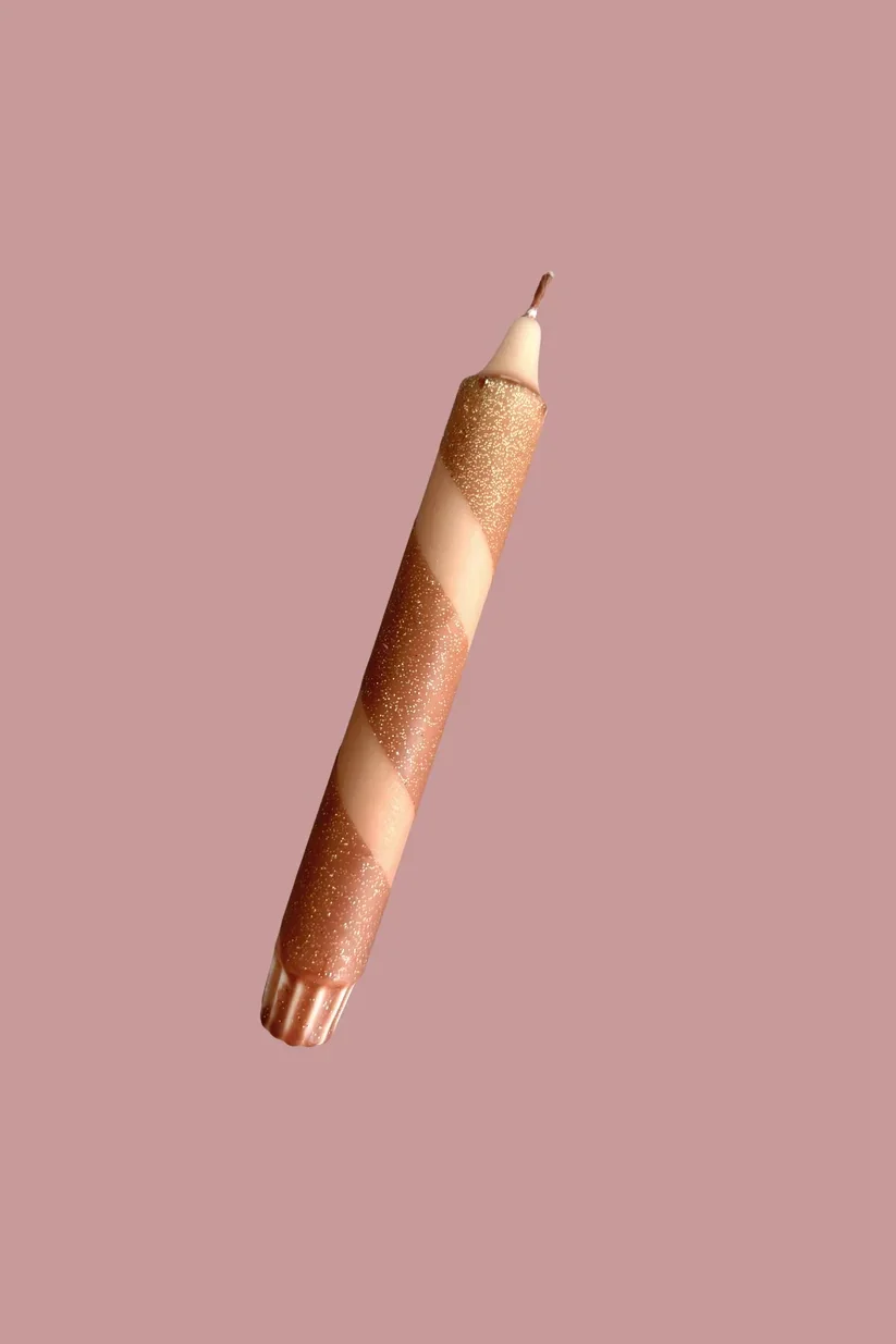 Voeg een warme, stijlvolle touch toe aan je interieur met de handgedipte Dip Dye Kaars Terra Goud Swirl. De combinatie van terra- en gouden swirl geeft een elegante en unieke look, perfect als accent in elk interieur en extra leuk voor de feestdagen!