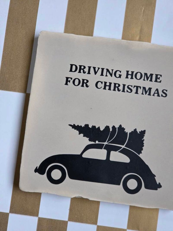 Dit keramieken kersttegeltje met de tekst “Driving Home for Christmas” brengt instant gezelligheid in huis. Het tegeltje heeft een zachte beige basis met een moderne zwarte vinylopdruk van een auto met een kerstboom op het dak — een iconisch beeld dat meteen het warme kerstgevoel oproept.