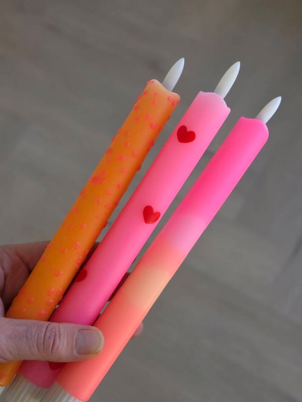 Breng gezelligheid en warme sfeer in huis met deze LED kaars in felle oranje, verrijkt met roze druppels! Een trendy toevoeging aan een vrolijk interieur!