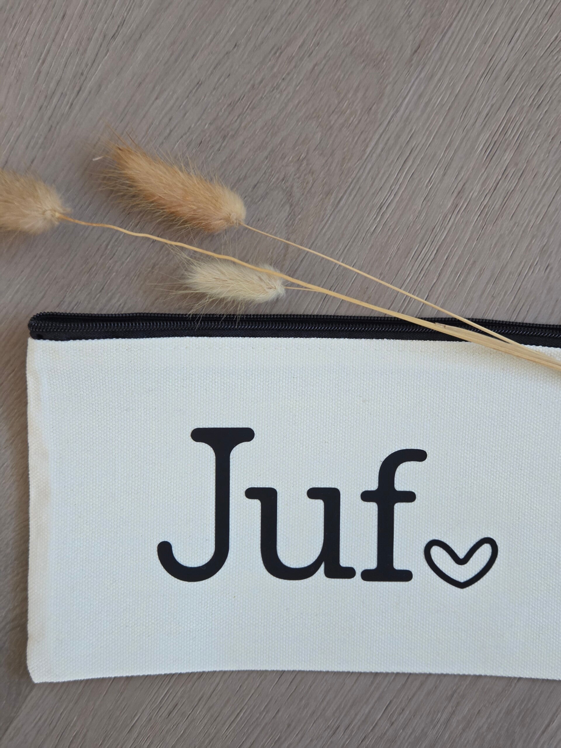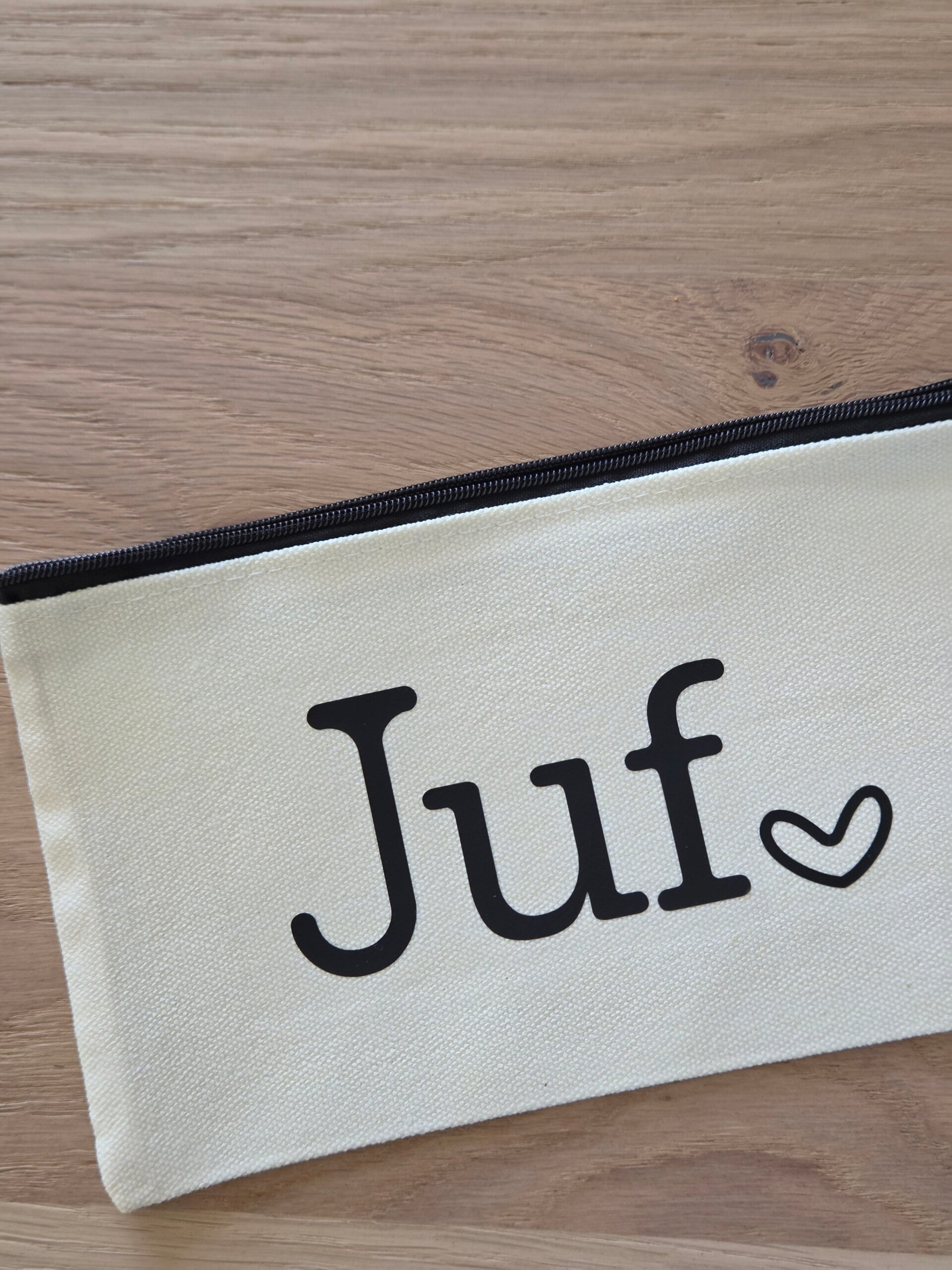 Op zoek naar een origineel bedankje voor de juf? Deze witte katoenen etui met de tekst “Juf” is een stijlvol en praktisch cadeau dat zeker in de smaak valt.
