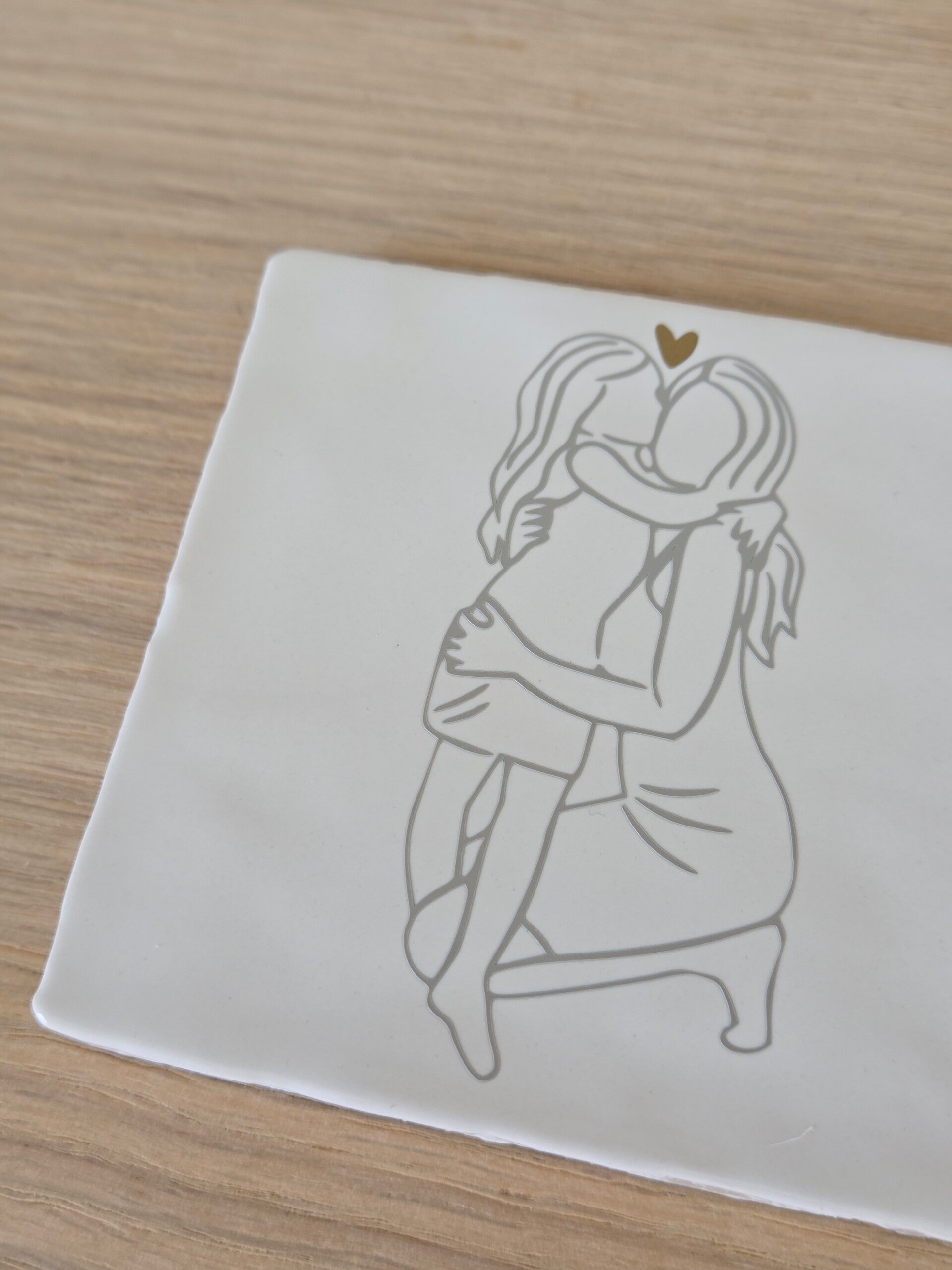 Op zoek naar een liefdevol en origineel cadeau voor jouw moeder? Dit witte keramieken tegeltje (10 x 10 cm) met een moeder en dochter illustratie in taupe en een subtiel gouden hartje is een prachtig symbool van jullie bijzondere band.